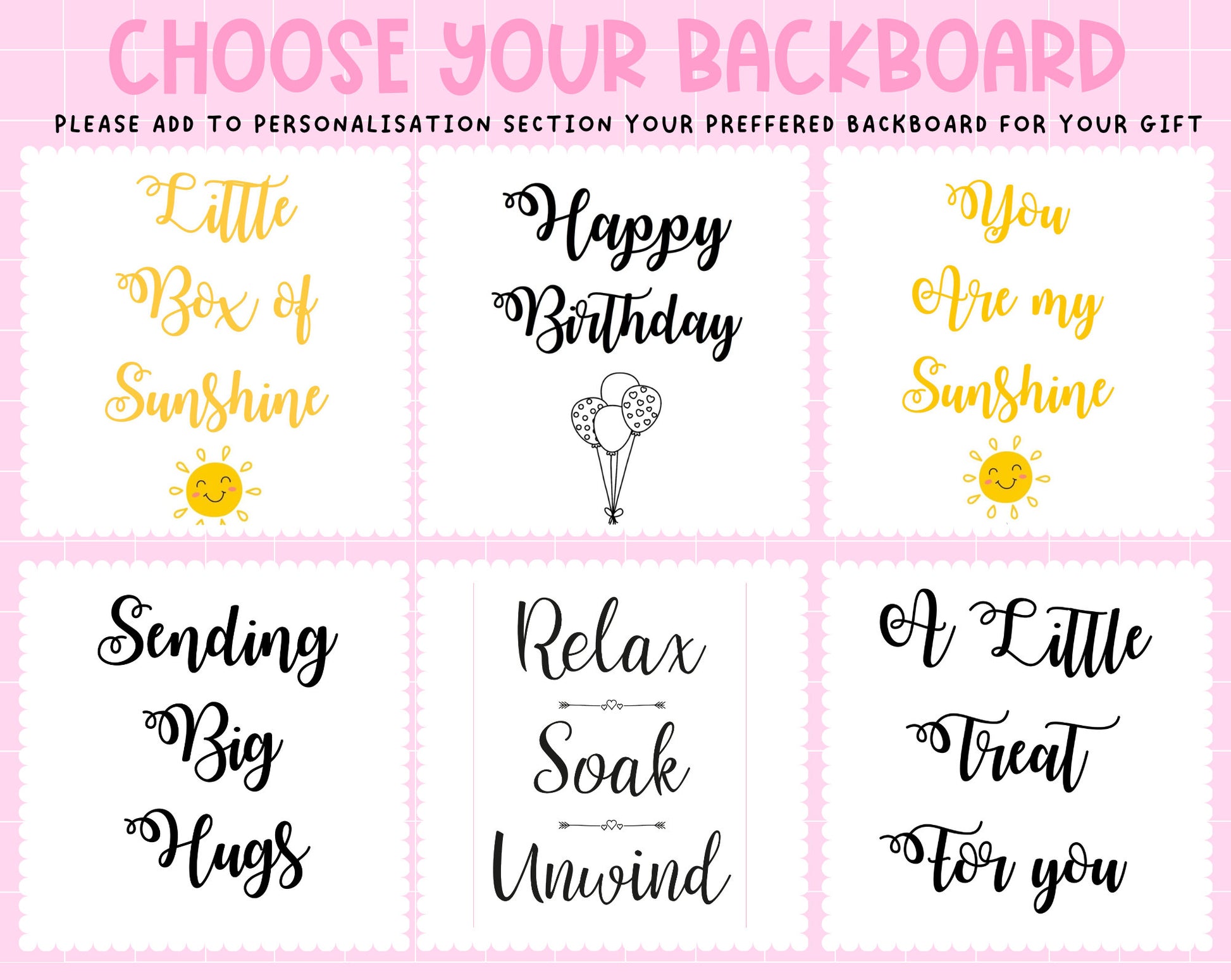 We will add the “ a little treat for you ” or “sending big hugs” print to the backboard of all boxes unless asked otherwise. We will use a little treat for you for the gift note or sending big hugs